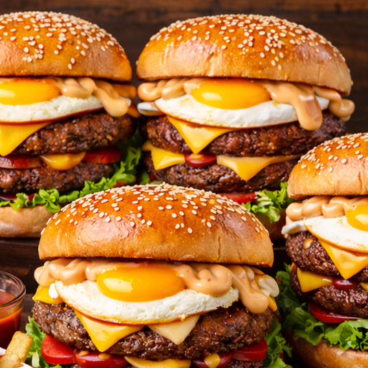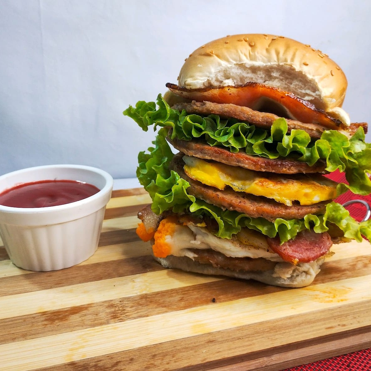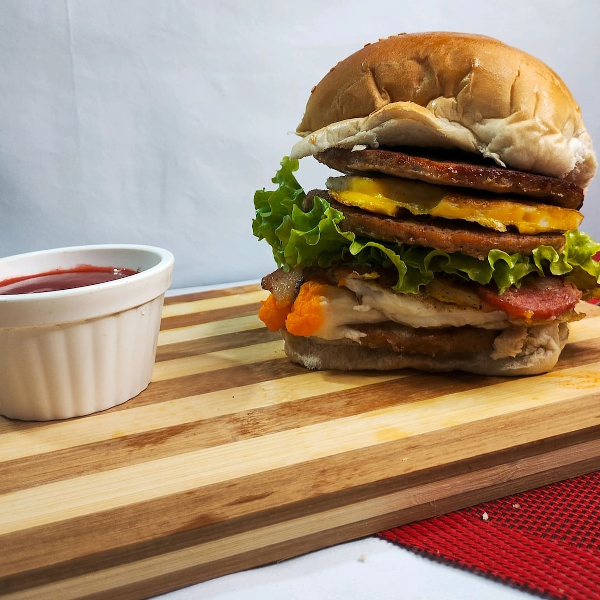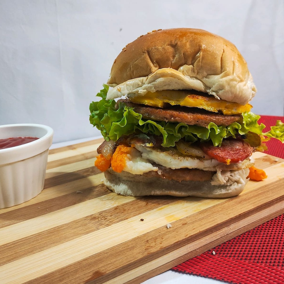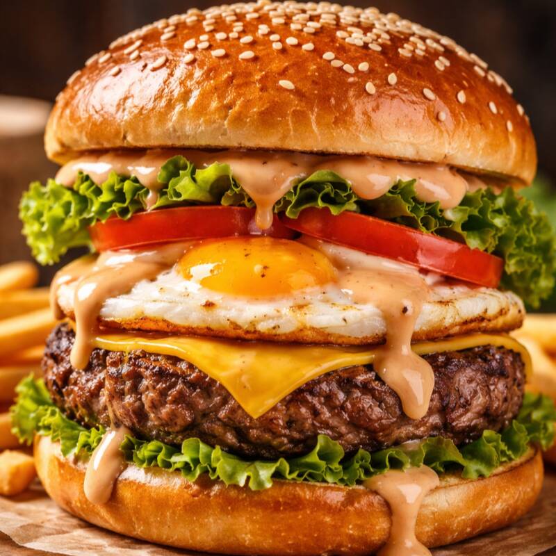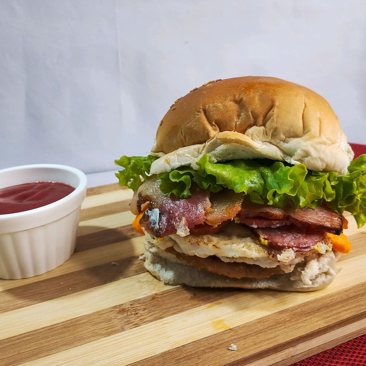 Pão de Corte, 2 Carnes de Picanha, 2 Ovos, Calabresa, Bacon, Cheddar, Catupiry, Molho Billy & Jack, Alface, Tomate