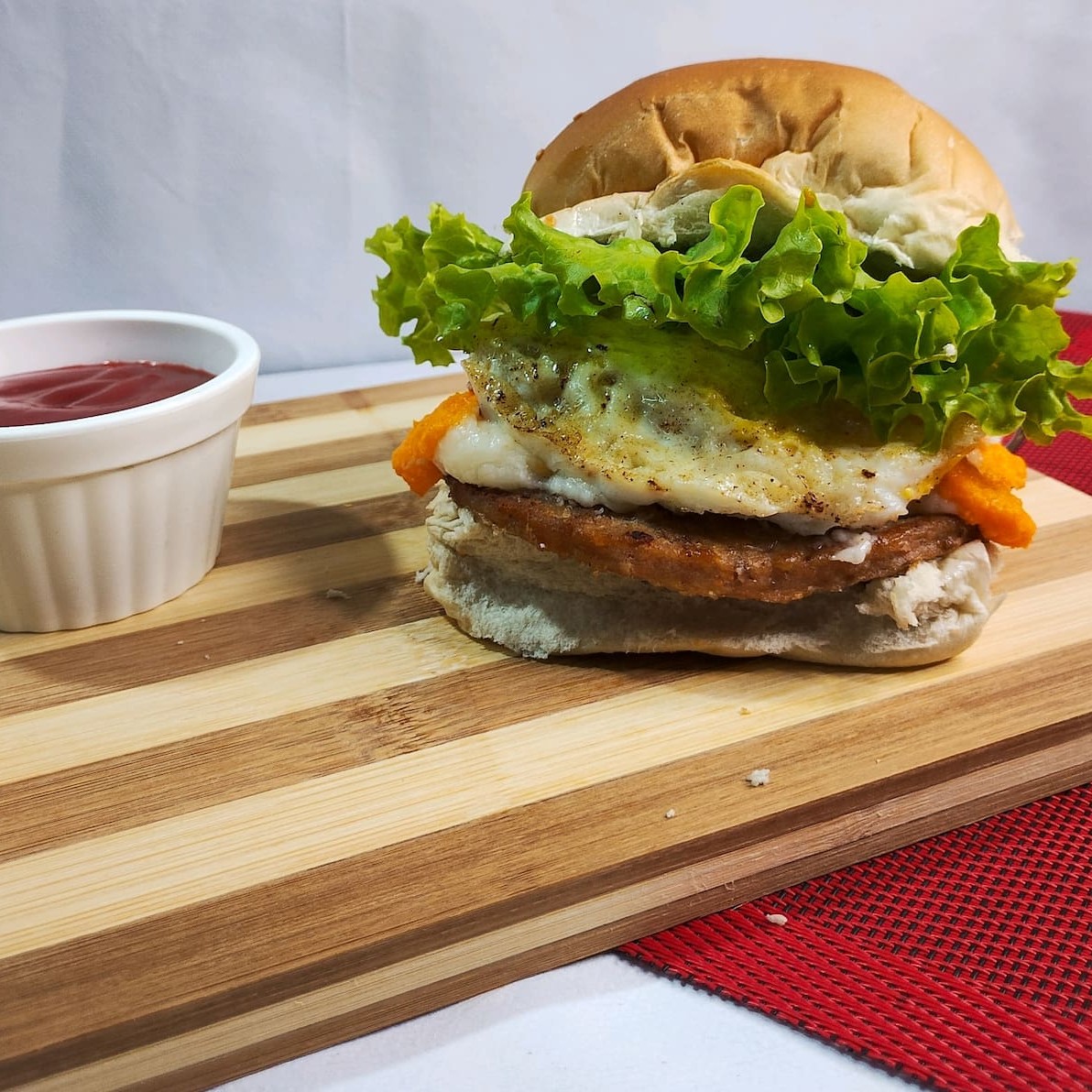Pão, hambúrguer, ovo, alface, ervilha, milho, beterraba, ketchup, maionese, mostarda, cheddar e Catupiry, Batata Frita com ketchup, maionese e orégano e Guaracamp