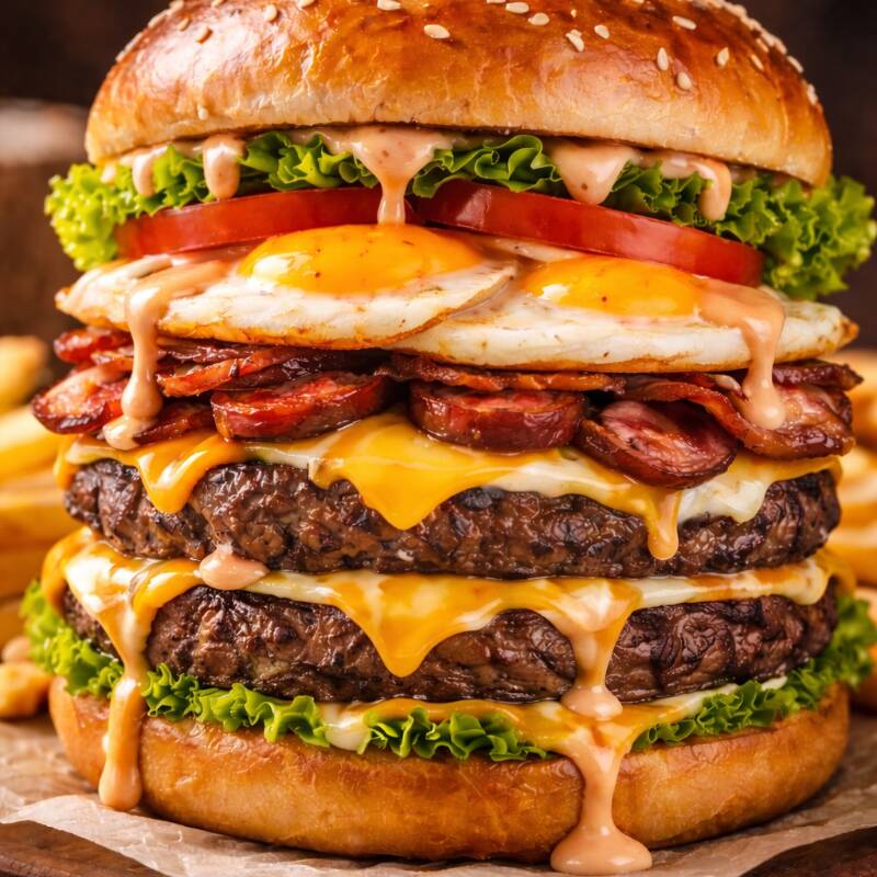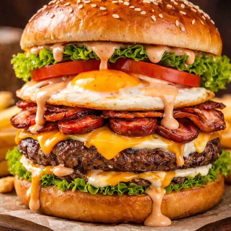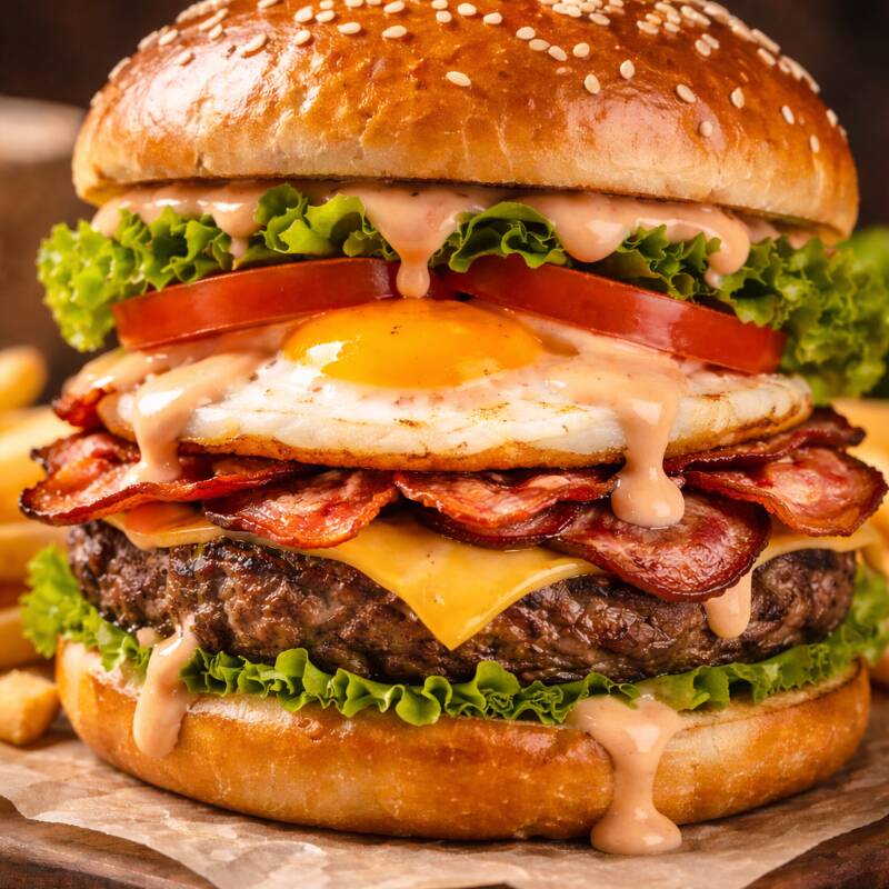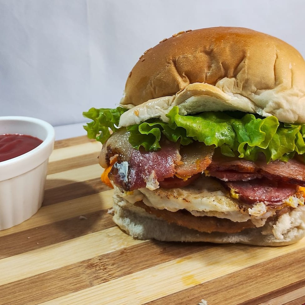 Pão, 2 hambúrgueres de picanha, 2 ovos, queijo, bacon, cheddar ou Catupiry, alface, milho, ervilha, cenoura e beterraba ralada, batata palha e queijo ralado