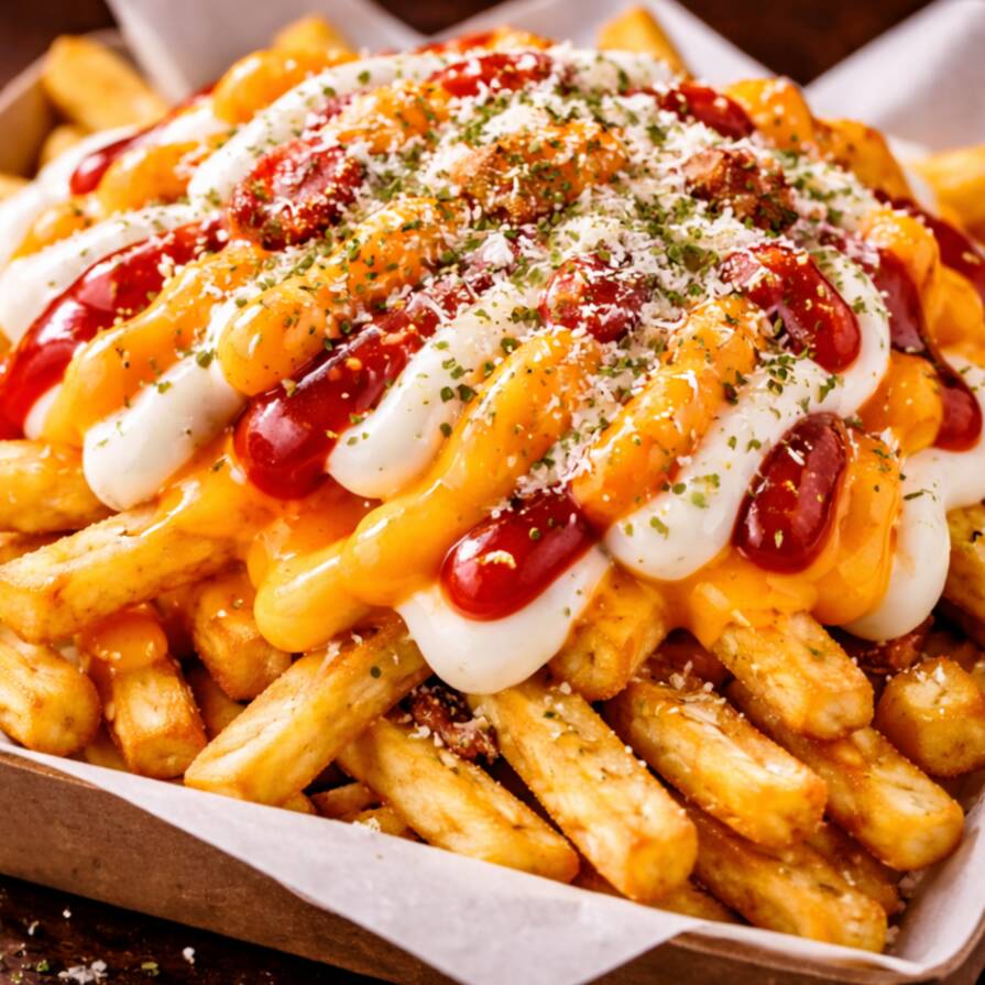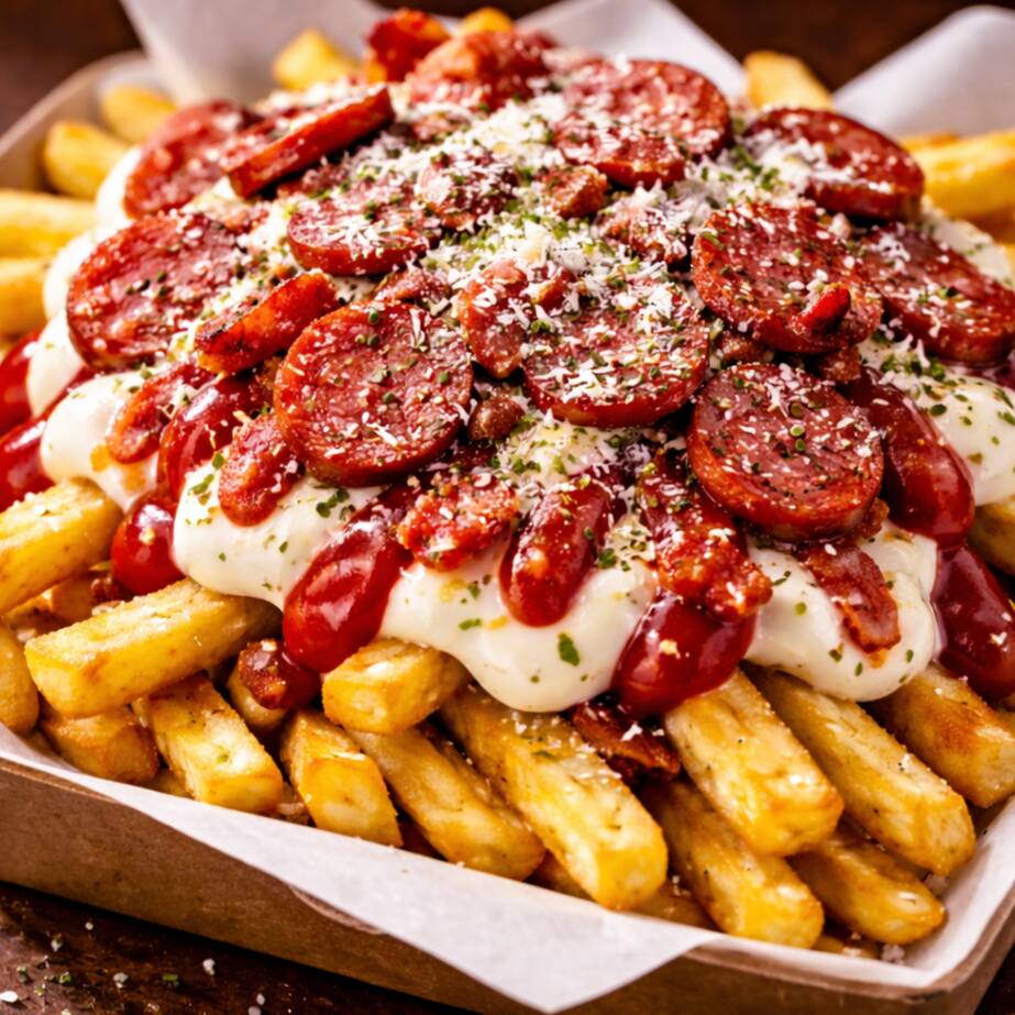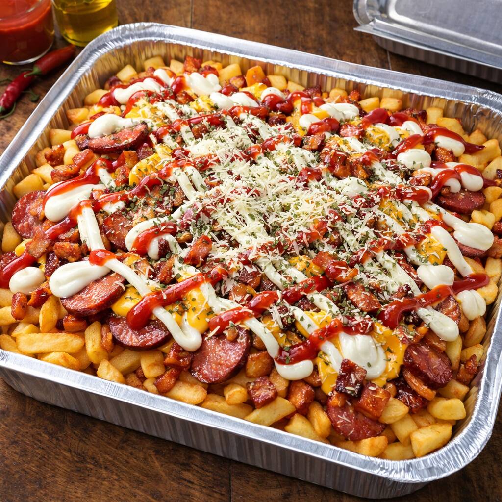 Batata Frita, Calabresa, Bacon, Catupiry, Cheddar, Queijo ralado, Orégano, Maionese, Ketchup (Serve 4 pessoas)