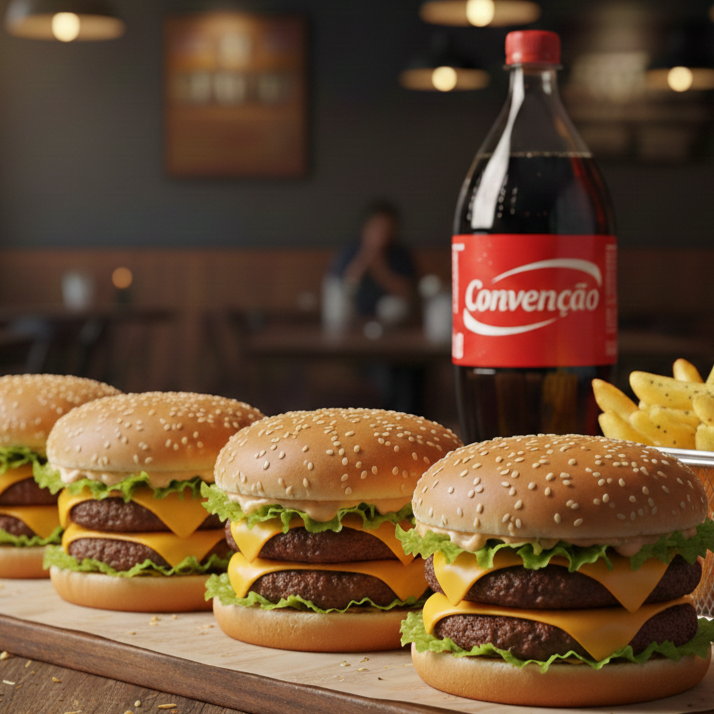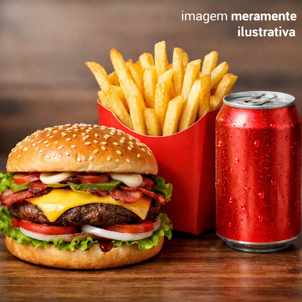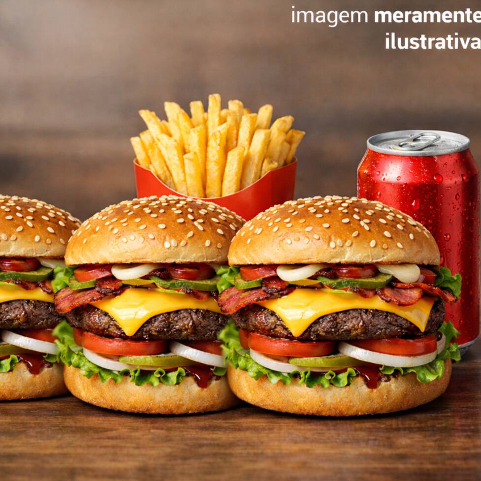 3 X-Burguer com Pão, Hambúrguer, Catupiry, Cheddar, Alface, Batata, Maionese, Ketchup e Mostarda, Batata Frita com Maionese, Ketchup e Orégano e Refrigerante 1l. IMAGEM MERAMENTE ILUSTRATIVA.