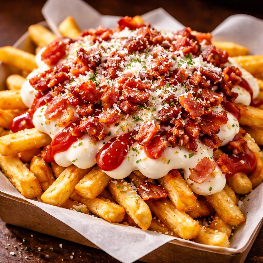 Batata frita com maionese, ketchup, queijo ralado, oregano e Bacon. IMAGEM MERAMENTE ILUSTRATIVA.