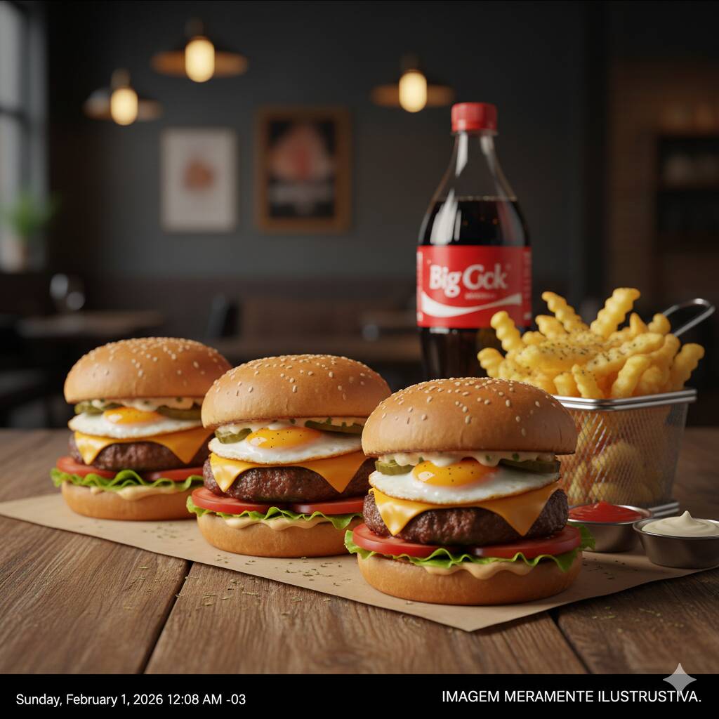 4 N° 4 com Pão de Corte, Carne, Calabresa, Ovo, Queijo, Molho Big Jack, Alface, Tomate, Batata Frita com Maionese, Ketchup, Orégano e Refrigerante 2l. IMAGEM MERAMENTE ILUSTRATIVA