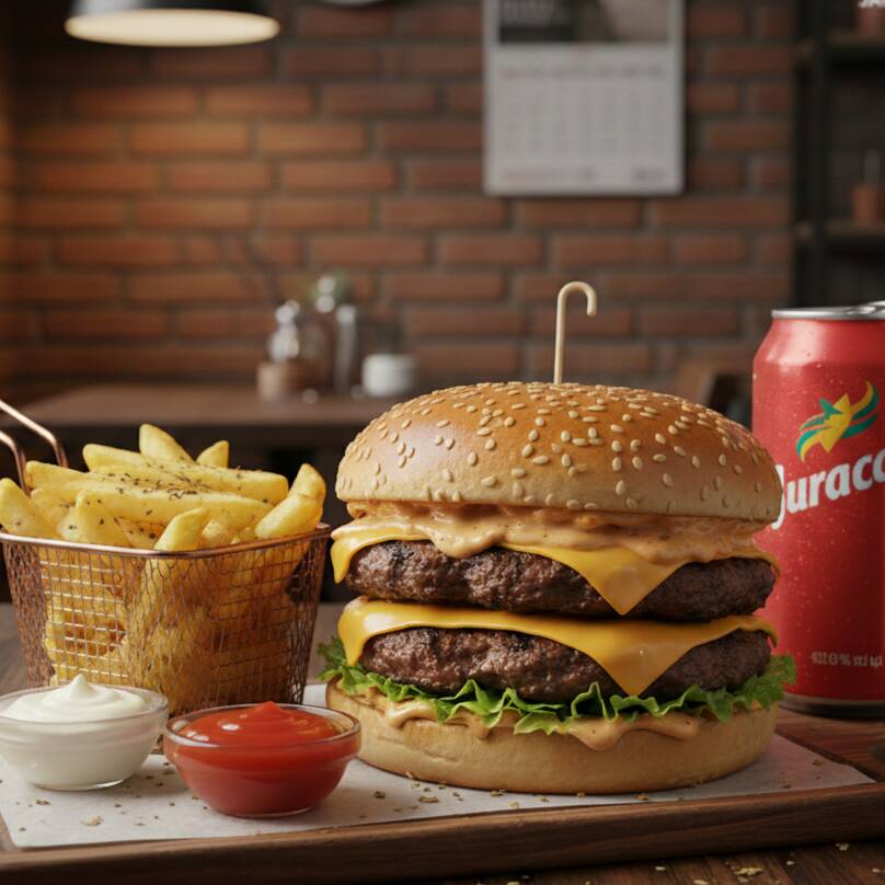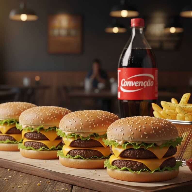 4 Hambúrgueres com Pão, Hambúrguer, Alface, Maionese, Ketchup, Mostarda e Batata Palha, Batata Frita com Ketchup, Maionese e Orégano e 4 Guaracamps
