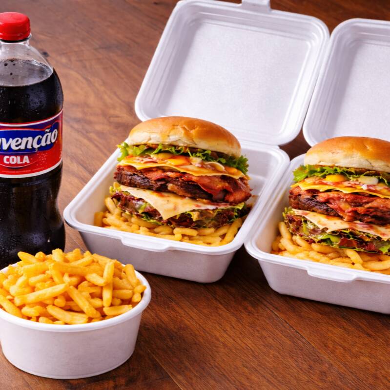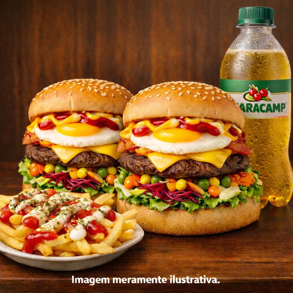 2 X-Burguer com Pão, Hambúrguer, Catupiry, Cheddar, Alface, Batata, Maionese, Ketchup e Mostarda, Batata Frita com Maionese, Ketchup e Orégano e 2 Guaracamps. IMAGEM MERAMENTE ILUSTRATIVA