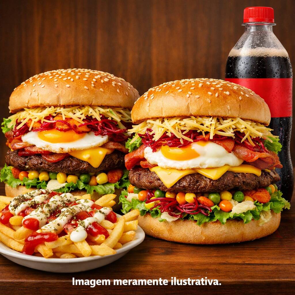 3 X-tudo com pão, hambúrguer, ovo, queijo, bacon, cheddar ou Catupiry, alface, milho, ervilha, cenoura e beterraba ralada, batata palha e queijo ralado, batata frita com ketchup, maionese e orégano e Refrigerante 1l. Imagem meramente ilustrativa