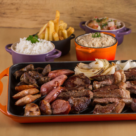 Nosso Delicioso churrasquinho Misto de Panela em tamanho Família! Acompanha: 1 Porção de Churrasco misto na quentinha redonda (Caprichado) 1 Porção de arroz, 1 porção de batata frita (P) 1 Molho Vinagrete, 1 pote farofa, 1 Porção de Salpicão, 1 pote de Feijão Tropeiro e 1 Refri 2 Litros.