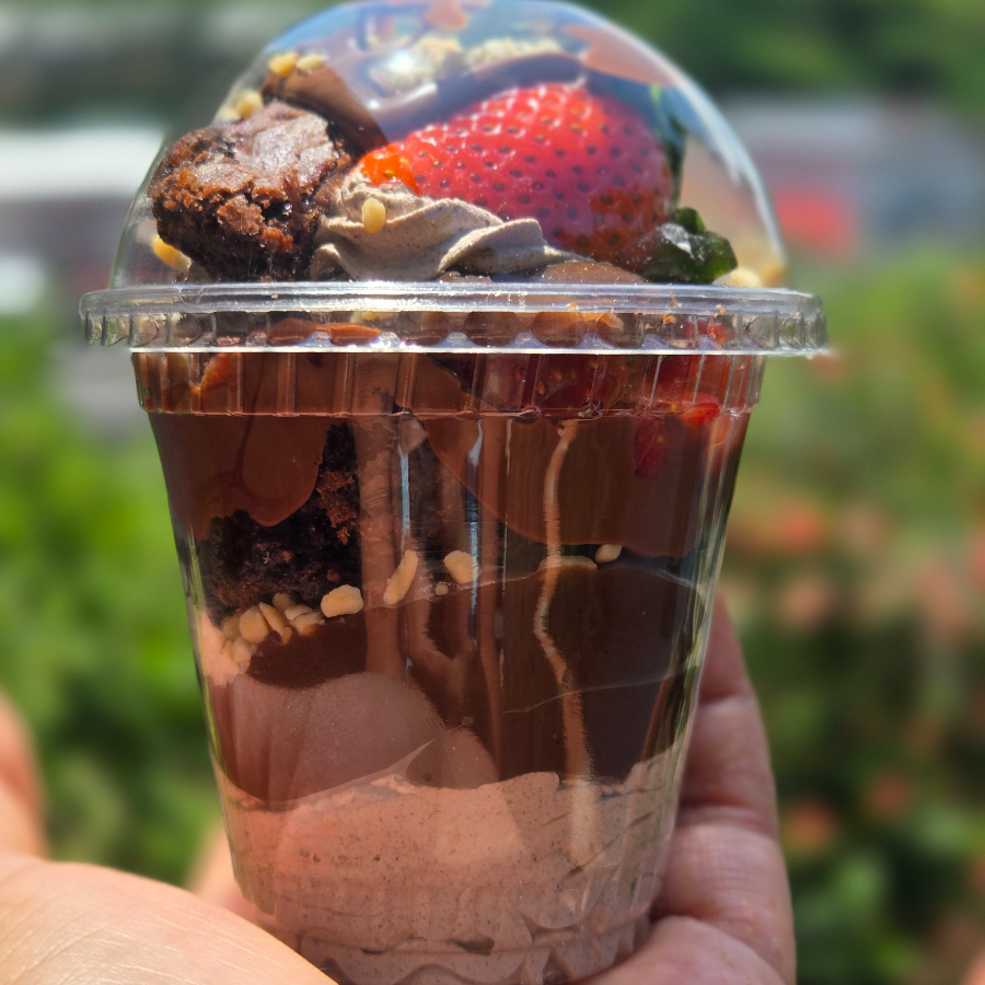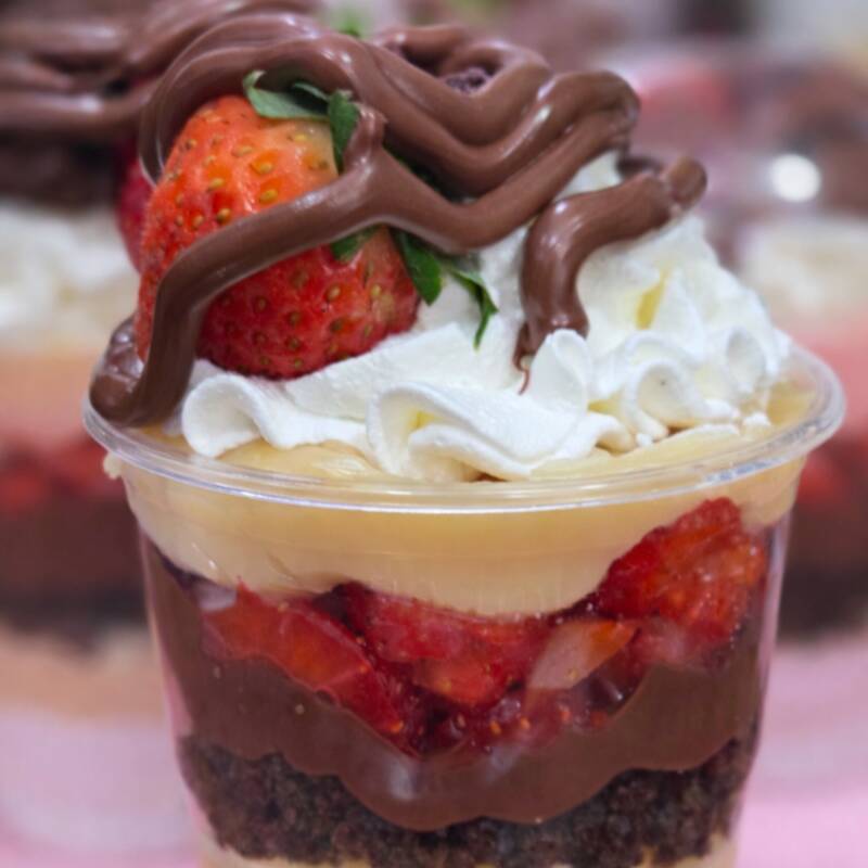 Nosso maravilho copo, com um delicioso mousse de chocolate, brigadeiro de chocolate 50% cacau, nutella, amendoim, brownie e morango. Uma combinação perfeita que todos amam. Aproimadamente 180 ml