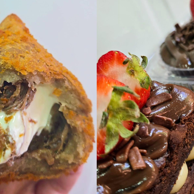 Brownie, pedaços de morangos, creme de ninho e nutella