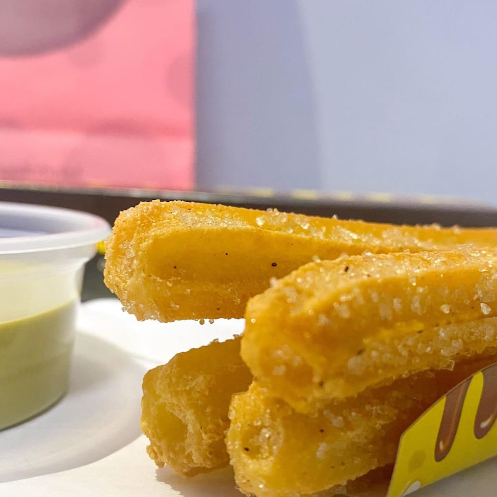 São 4 deliciosos churros tipo espanhol com um potinho cheio de creme de Pistache para mergulhar seus churros e se lambuzar!