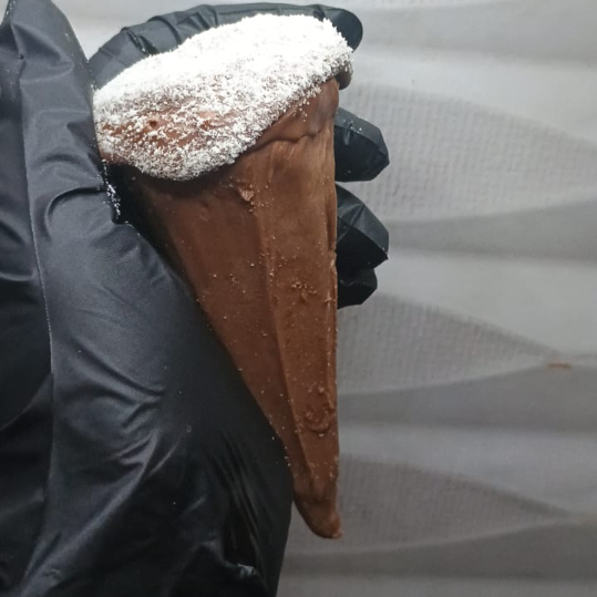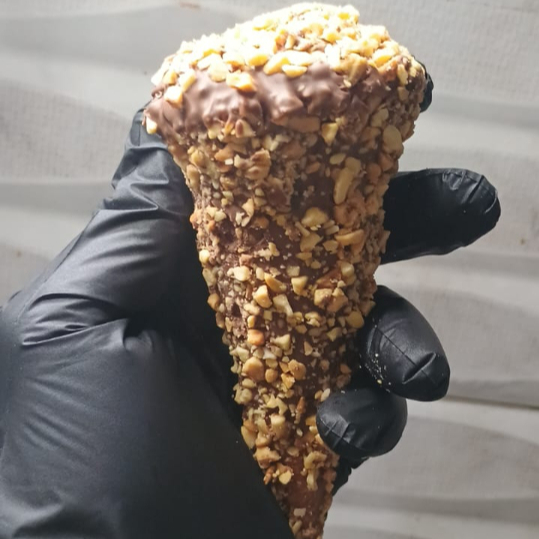 Casquinha banhada no chocolate, recheada com ninho e nutella, finalizada com ninho