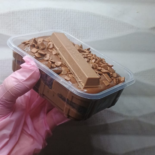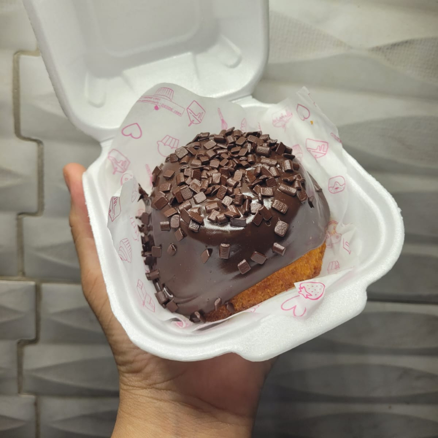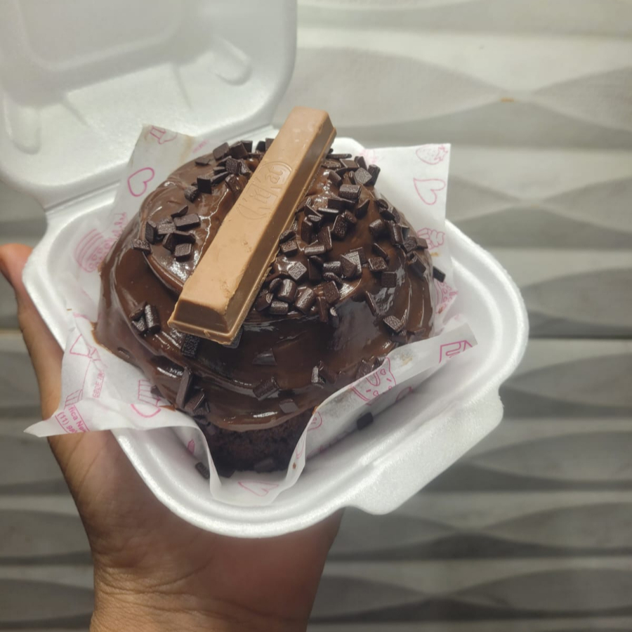 Massa bolo feita com chocolate em pó 50%, mousse chocolate e brigadeiro, pesa em média 150 gramas.