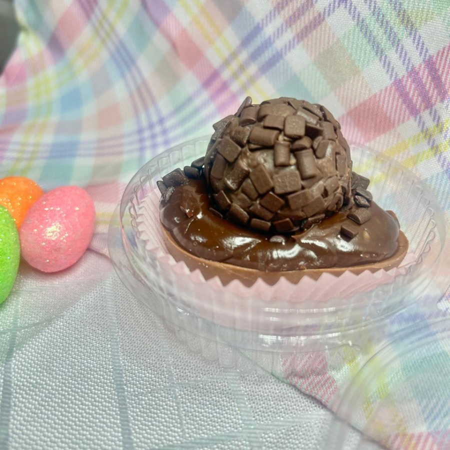 Mini ovinho de chocolate ao leite, recheado de chocolate e ninho, finalizado com delicioso brigadeiro de ninho. peso médio 75 gramas.
