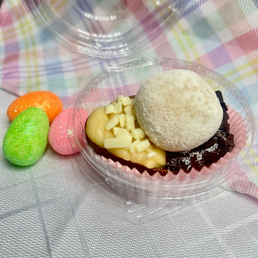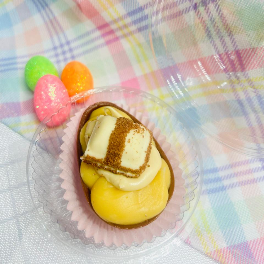 Mini ovinho de chocolate ao leite, creme branco, creme bueno e bombom kinder. peso médio 75 gramas
