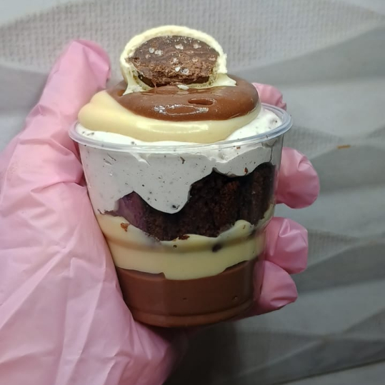 Delicioso copo da felicidade, camada de chocolate, brownie, creme branco, camada bombom picado ouro branco, finalizado com bombom ouro branco. (250 ml)