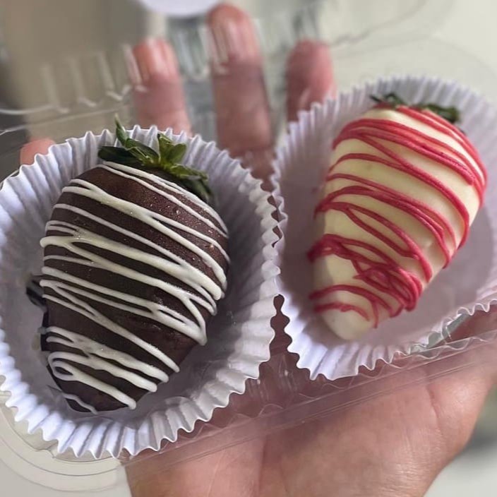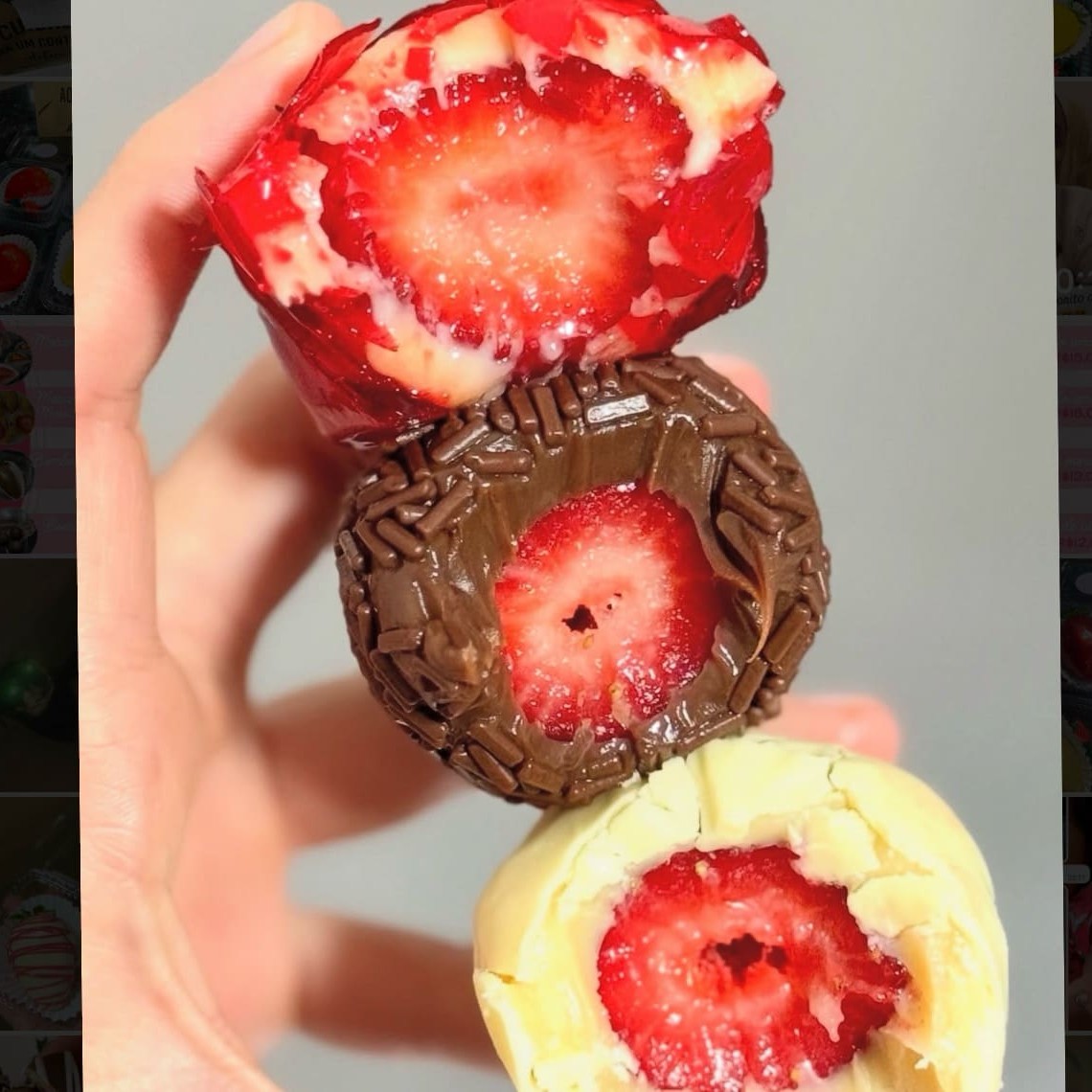 01 morango do amor + 01 bombom de morango com creme de Ninho e chocolate branco + 01 bombom de morango com creme de chocolate e chocolate meio amargo