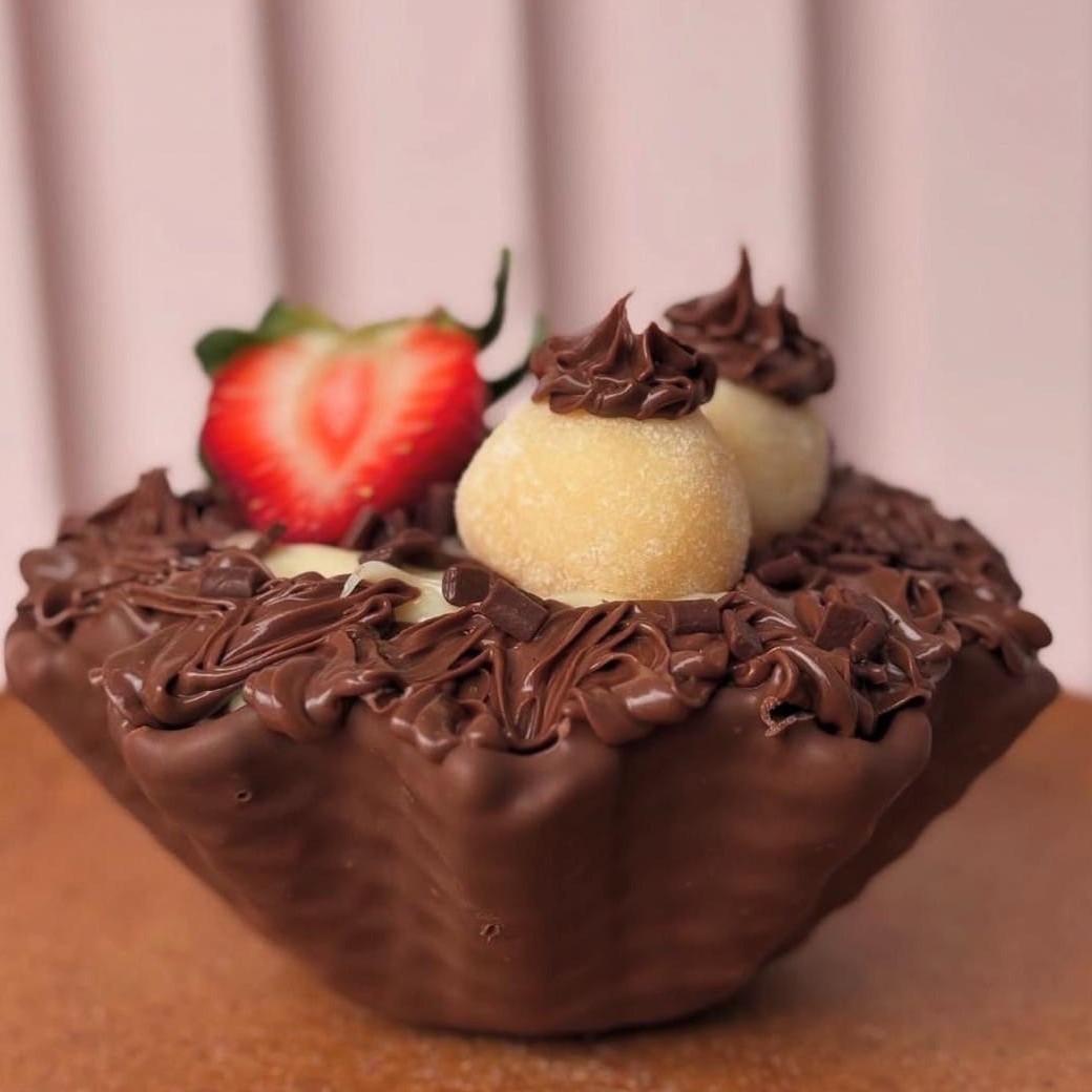 Cada cestinha da Doce Recreio é feita com cuidado: começamos com a casquinha crocante, mergulhamos no chocolate meio amargo, preenchemos com creme de Ninho, colocamos morangos frescos e finalizamos com Nutella. Um passo de cada vez, até chegar na perfeição.