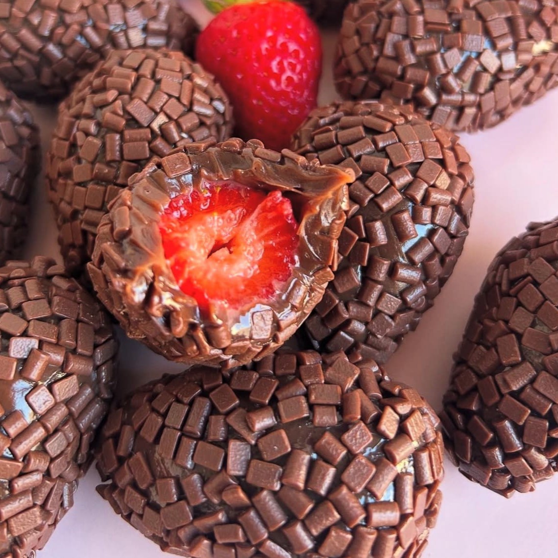 Bombom de morango com doce de Ninho e cobertura de chocolate meio amargo