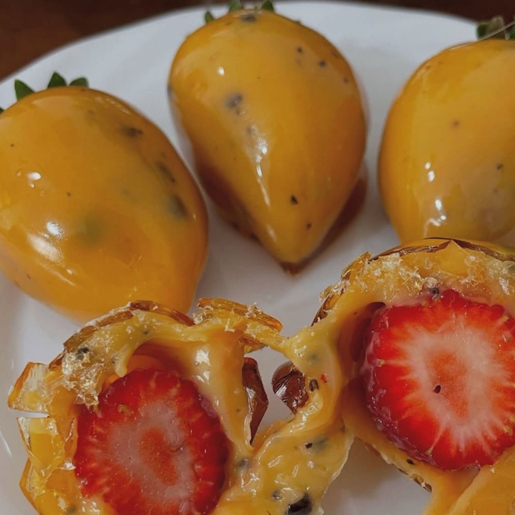 Morango com creme de Ninho e maracujá e chocolate meio amargo