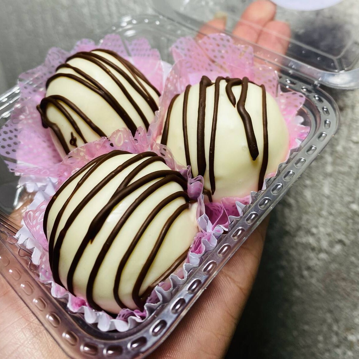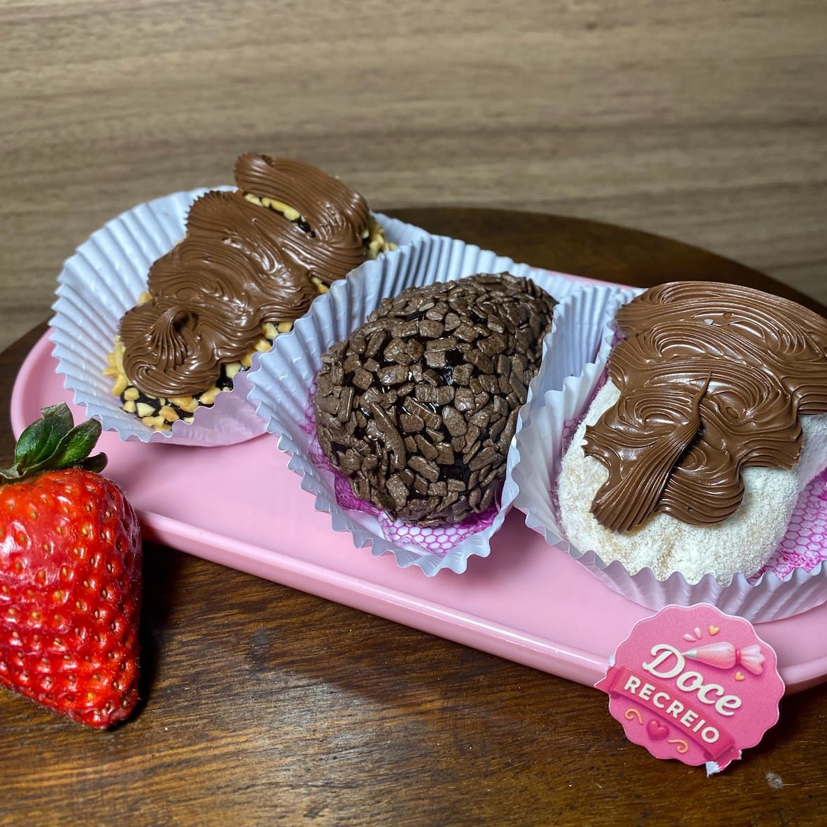 1 coxinha de brigadeiro com granulado. 1 coxinha de ninho e nutella. 1 coxinha de Ferrero Rocher