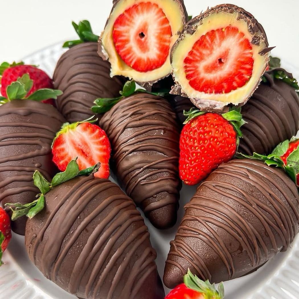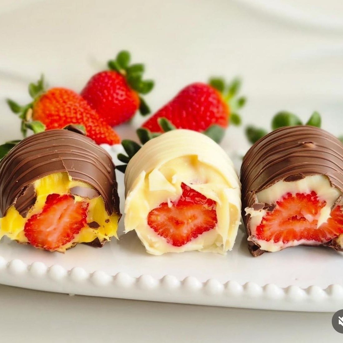 Morango com creme de Ninho e cobertura de chocolate meio amargo e chocolate branco