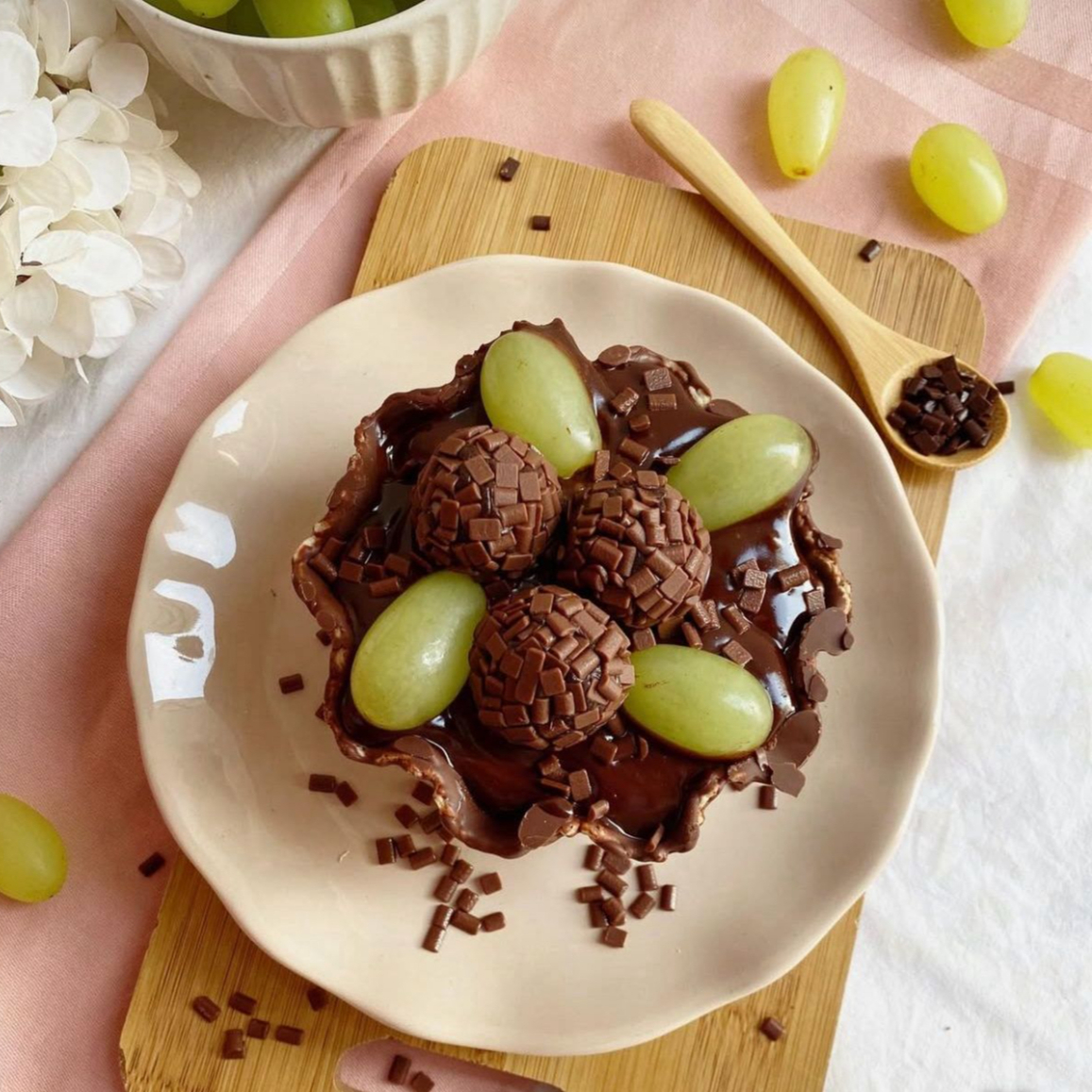 Casquinha de sorvete banhada no chocolate meio amargo, recheada com creme de ninho,uva e nutella