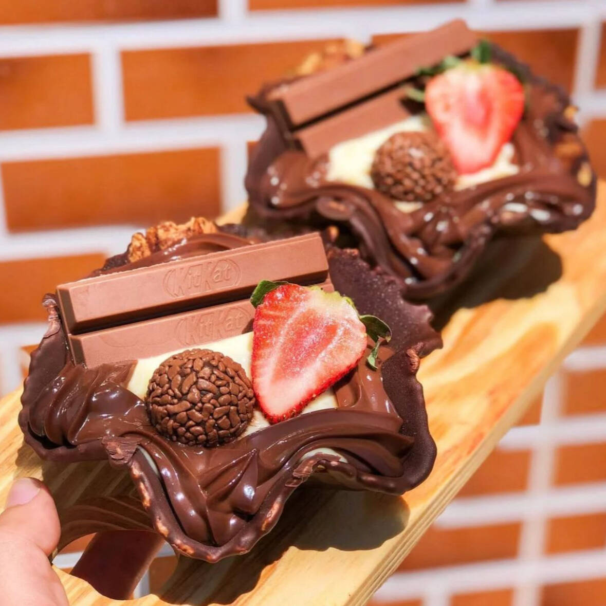 Casquinha de sorvete banhada no chocolat meio amargo, recheada com creme de ninho, morango, nutella e kitkat