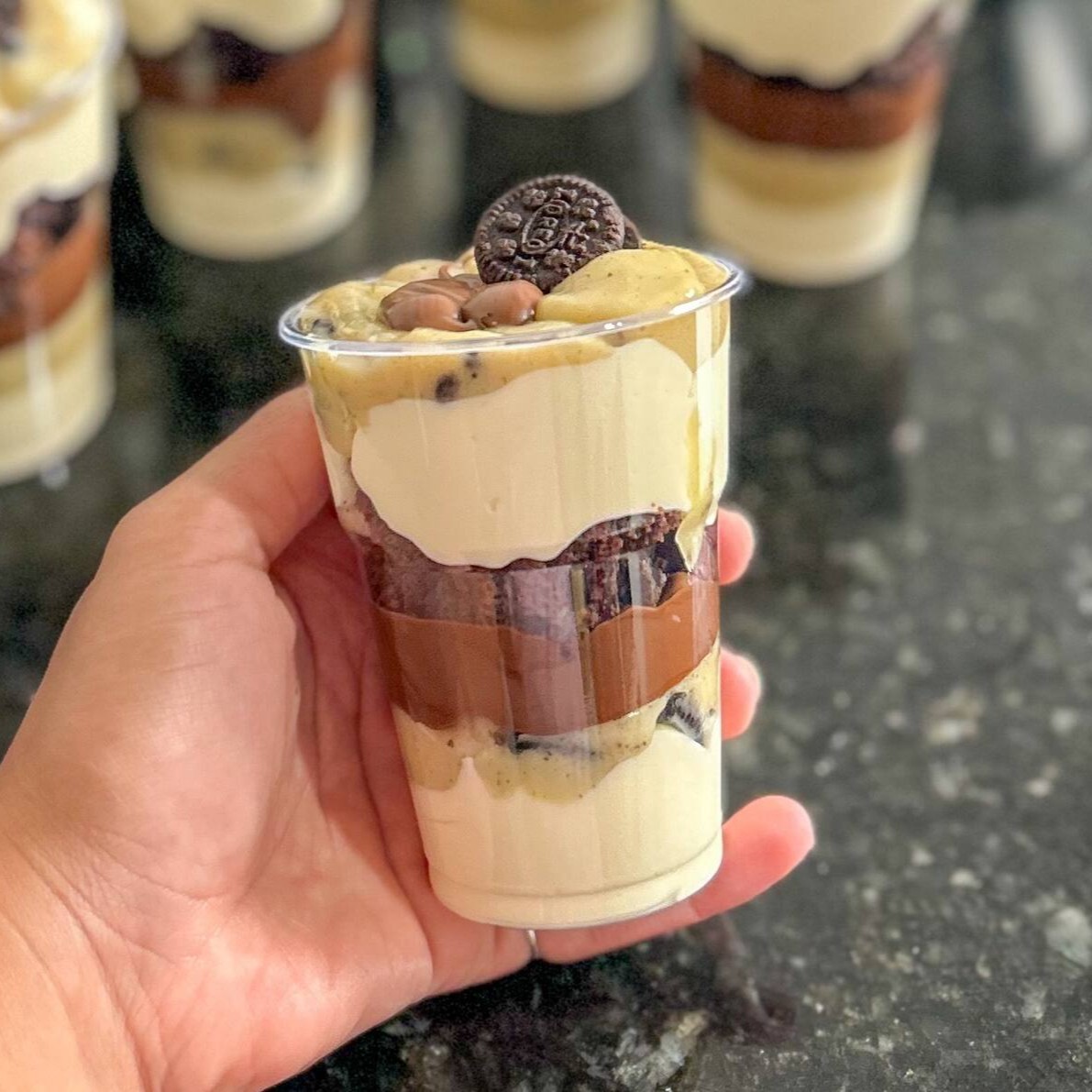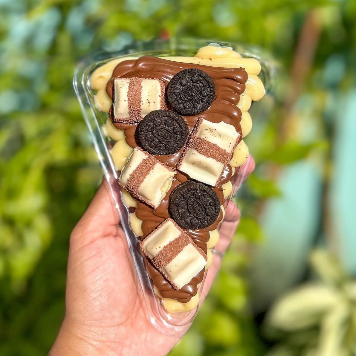 Contém camadas de mousse de Ninho levinho, brigadeiro de Oreo cremoso, o brownie perfeito e muita Nutella.