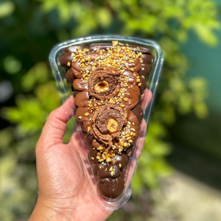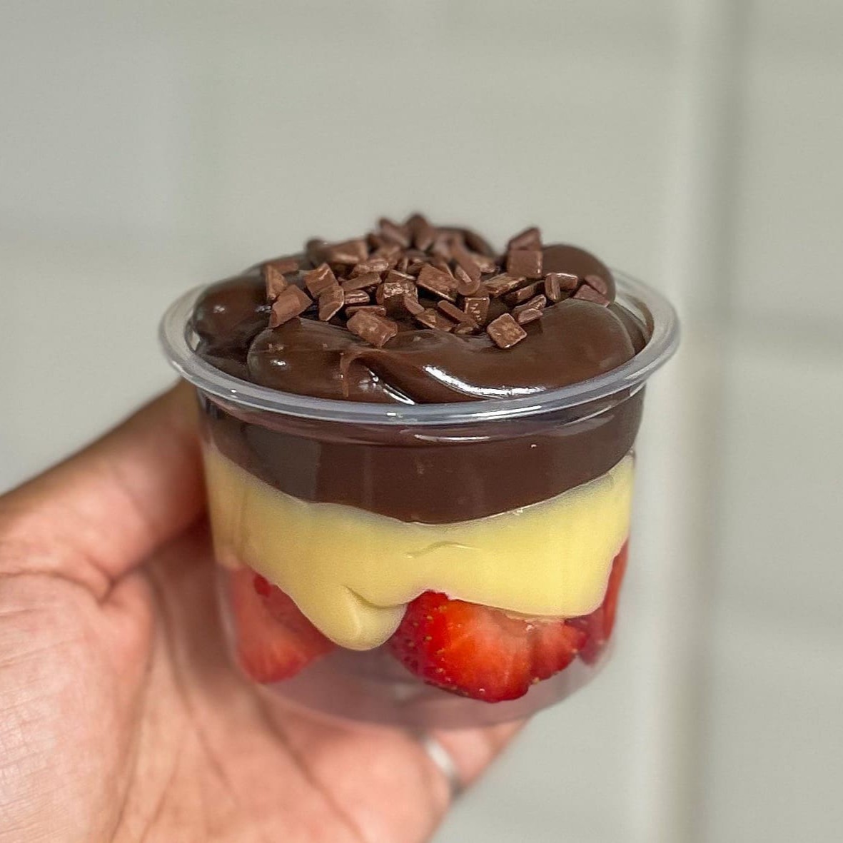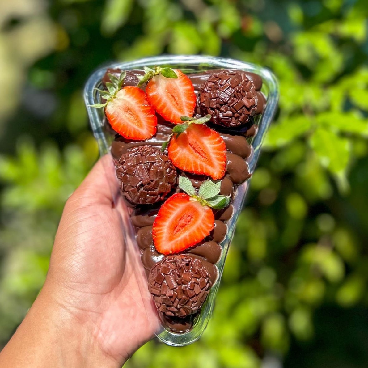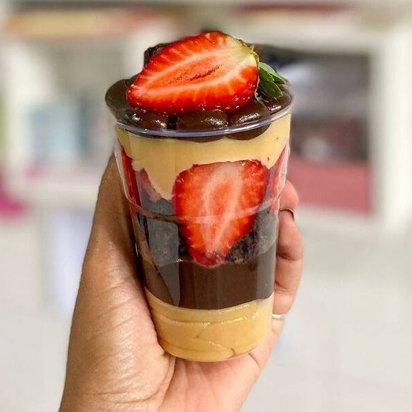 Composto por morangos frescos, brigadeiro cremoso de Ninho e brigadeiro de chocolate ao leite, finalizado com chocolate granulado.