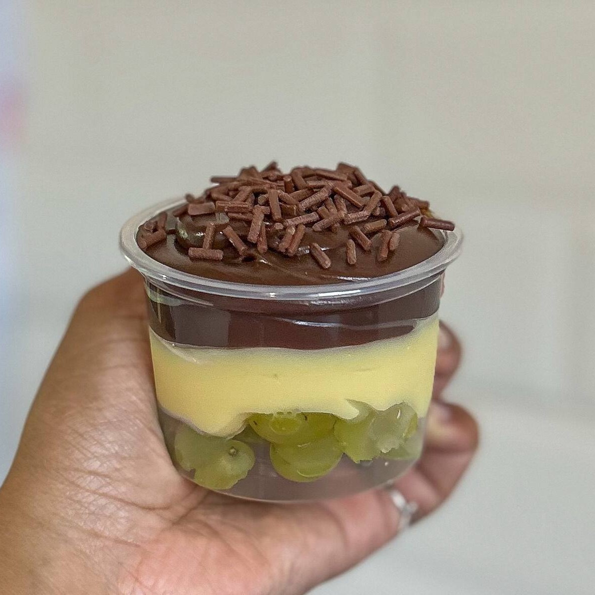 Composto por uva verde, brigadeiro cremoso de Ninho e brigadeiro de chocolate ao leite, finalizado com chocolate granulado.