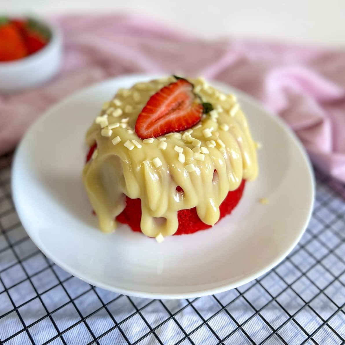 Deliciosa massa redvelvet, coberta com brigadeiro de leite Ninho cremoso, finalizado com granulado de chocolate branco e morango.