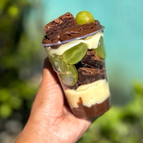 Contém camadas do cremoso brigadeiro ao leite, brigadeiro de Ninho, brownie super molhadinho e muitas uvas.