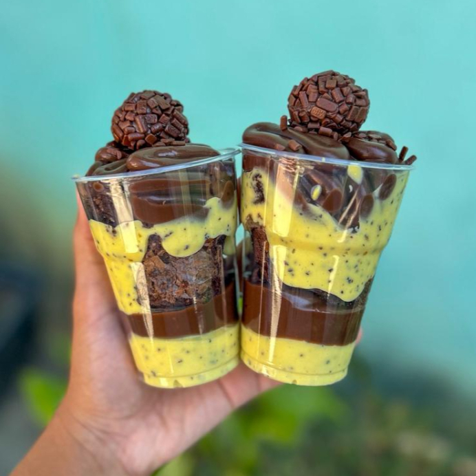 A perfeita combinação do mousse cremoso de maracujá da fruta, brownie perfeito e brigadeiro ao leite. Finalizado com um delicioso brigadeiro de chocolate.