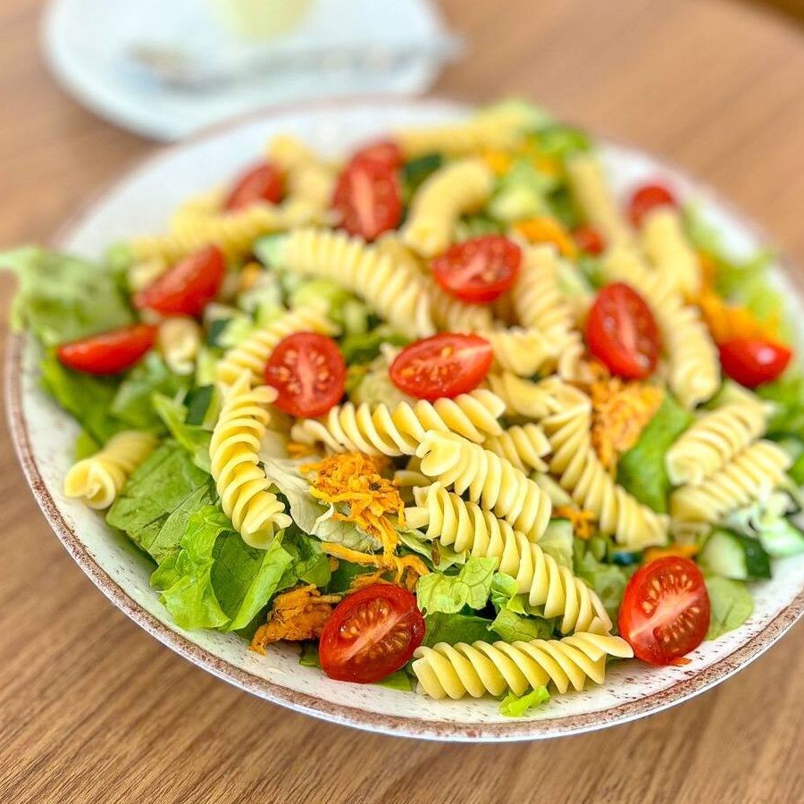 Deliciosa salada com alface, macarrão, pepino, tomatinhos, frango desfiado temperado, acompanhada de maionese de mostarda e mel