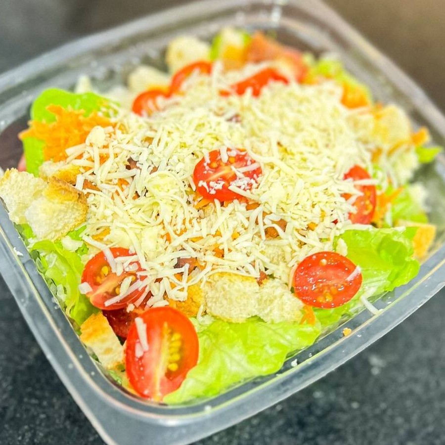Uma combinação refrescante de alface, tomatinhos, cenoura ralada, bacon crocante, crotouns, queijo parmesão fresco ralado, frango desfiado e nossa maionese caseira. Obs: Maionese caseira vai separada.
