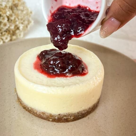 Nossa deliciosa cheesecake com base de biscoito crocante, saboroso creamcheese e finalizado com a saborosa geleia de frutas vermelhas caseira. Obs: Geleia de frutas vermelhas vai separada para não virar o produto.