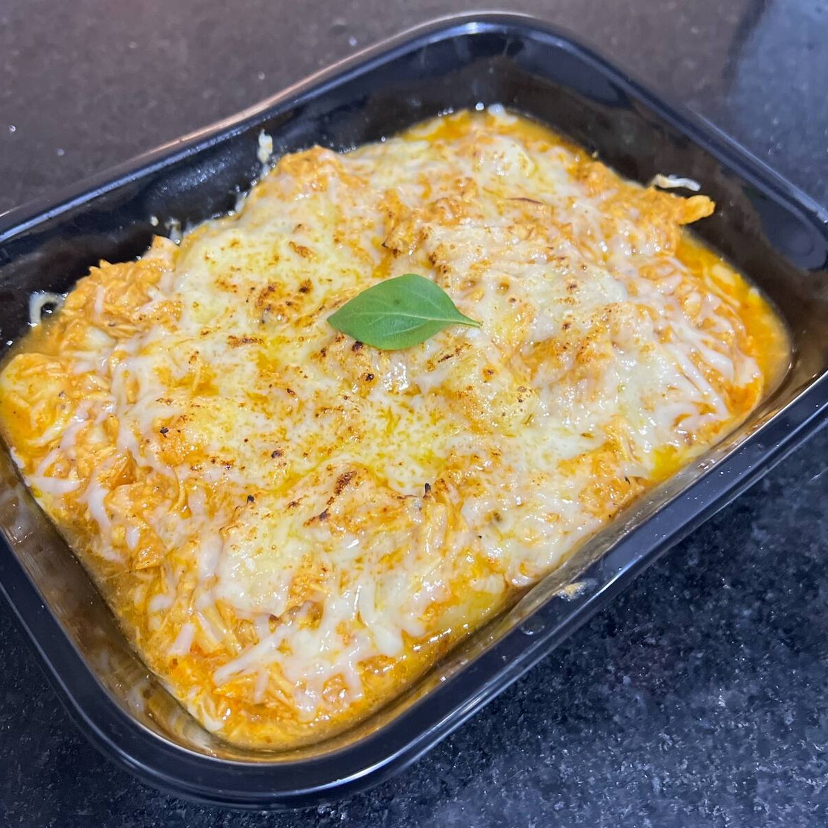 Delicioso nhoque de batata e recheio de frango temperado e finalizado com queijo parmesão fresco Vai em embalagem que pode ir ao microondas ou ao forno, basta lembrar de tirar a tampa que é de plástico.