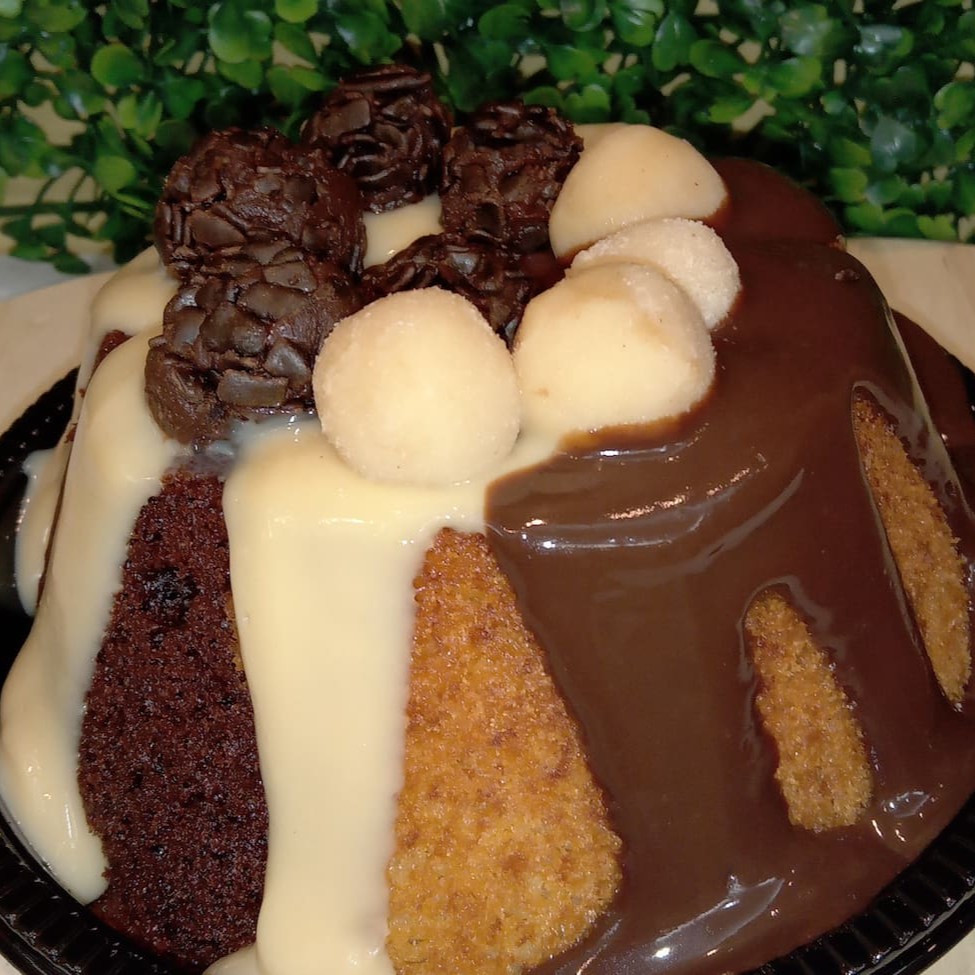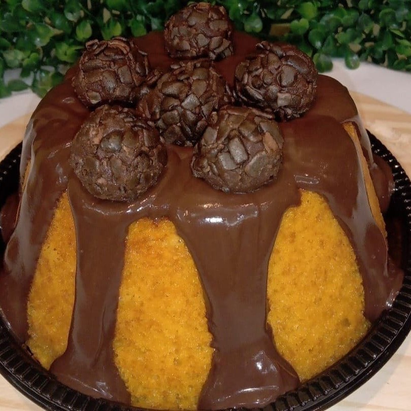 Deliciosa massa de chocolate amanteigada, úmida, macia, perfeita com cobertura de brigadeiro cremoso delicioso perfeito e decorado com 5 brigadeiros gourmet Serve até 6 fatias.