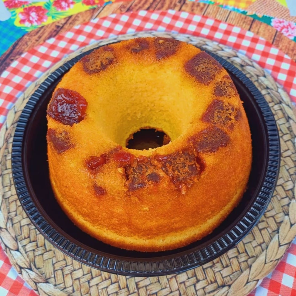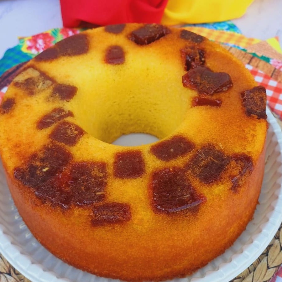 Saborosa massa de fubá com queijo parmesão, coco em flocos, q torna esse bolo maravilhoso e pedaços de goiabada cascão ,que da um toque adocicado, uma combinação perfeita. Serve ate 12 fatias.