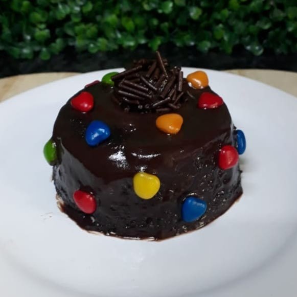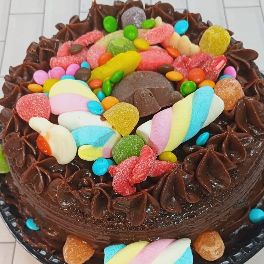 Delicioso bolo de chocolate , úmido ,macio, coberto com brigadeiro cremoso perfeito e com uma variedades de doces finni e outros em cima. Serve ate 12 fatias.