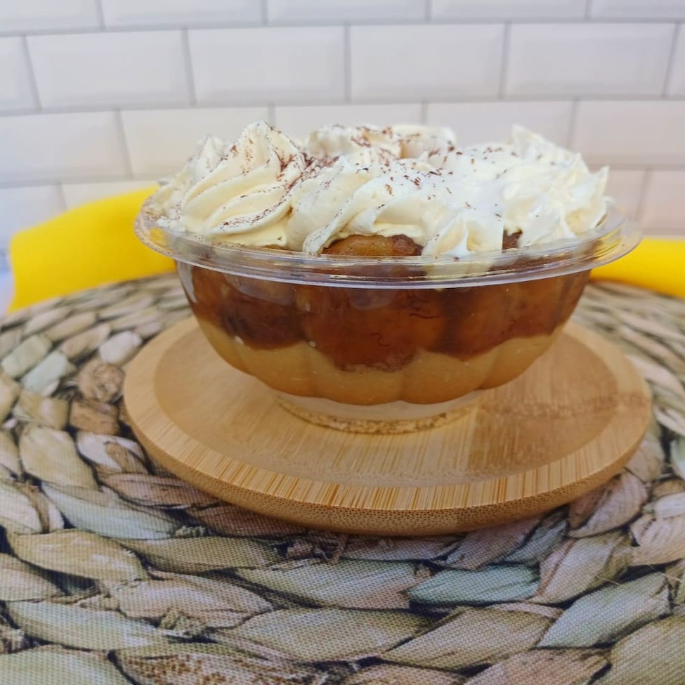 Delicioso biscoito de leite maltado picado,(vaquinha) ,doce de leite,banana caramelada e chantilly de doce de leite