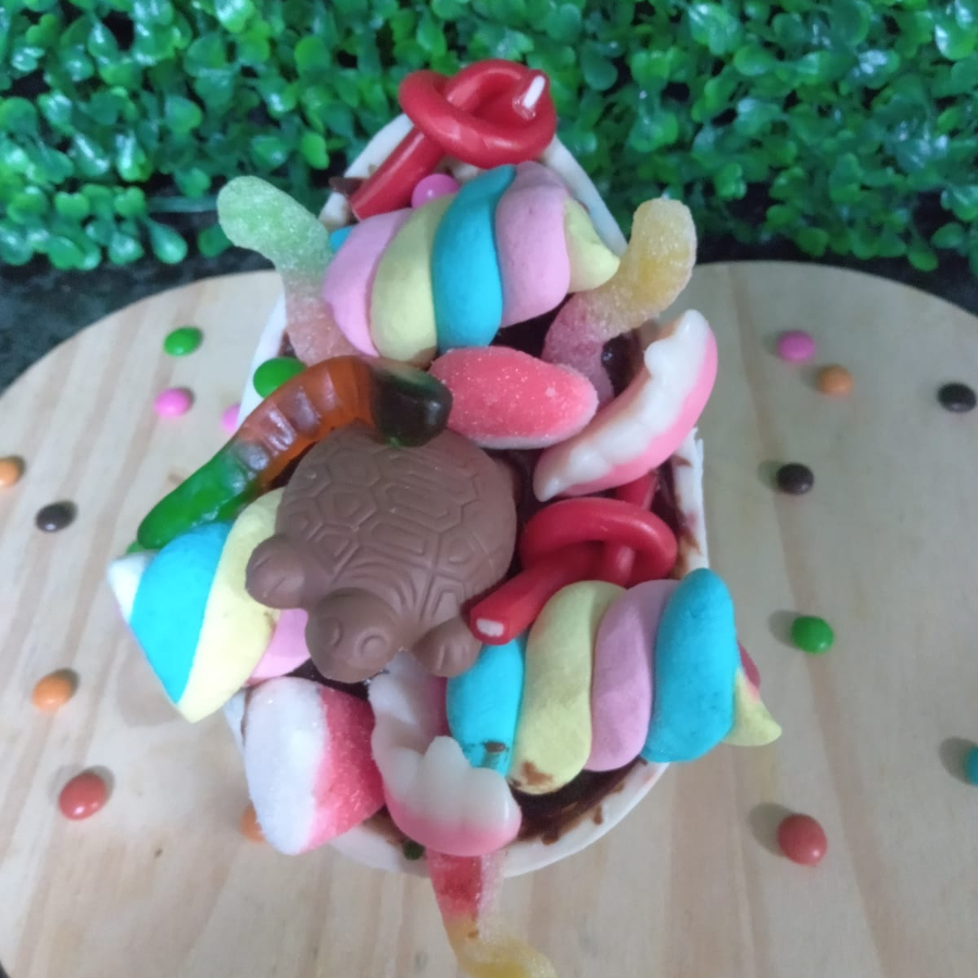 Casca de chocolate ao leite recheado com brigadeiro e doces variados