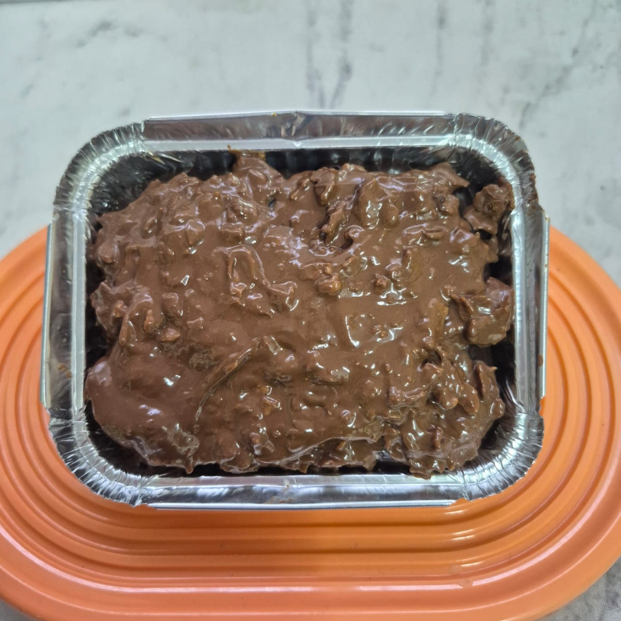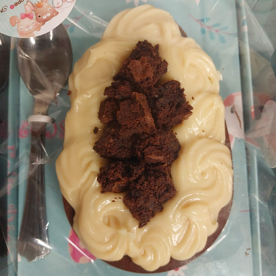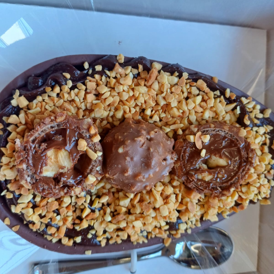 Casca de chocolate ao leite recheado com brigadeiro , ninho e pedacos de brownie. 400 grs aproximadamente