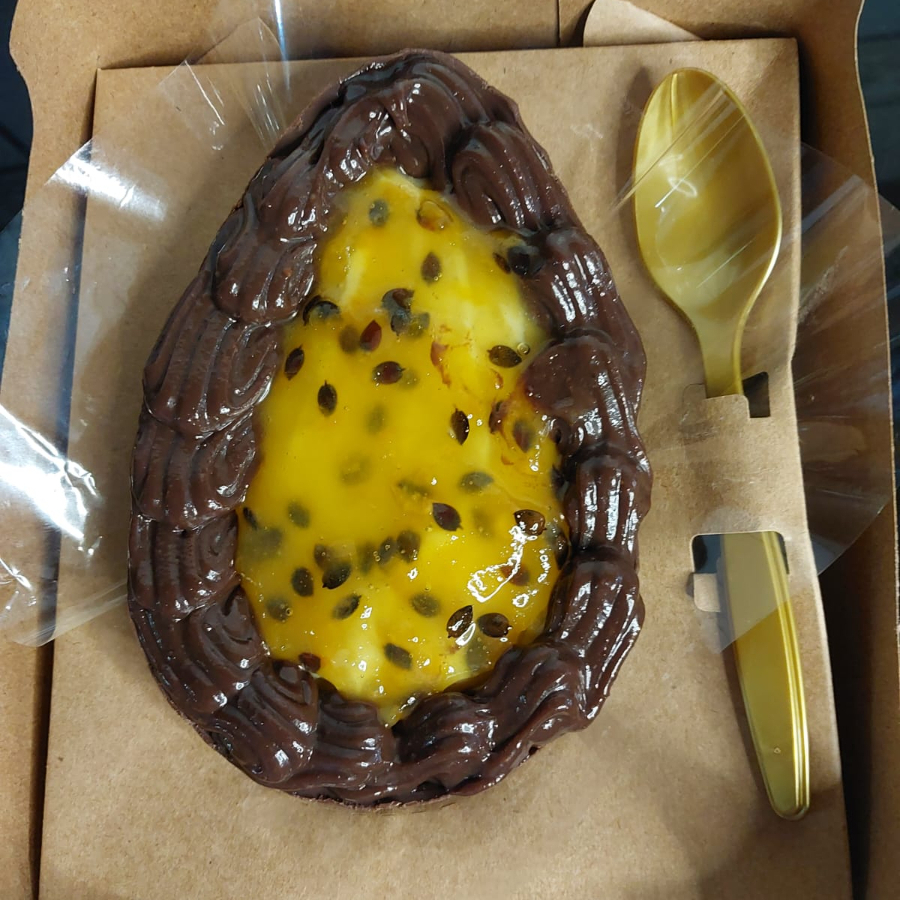 Casca de chocolate ao leite recheado com brigadeiro e nosso creme de maracuja saborizado com a recducao da fruta