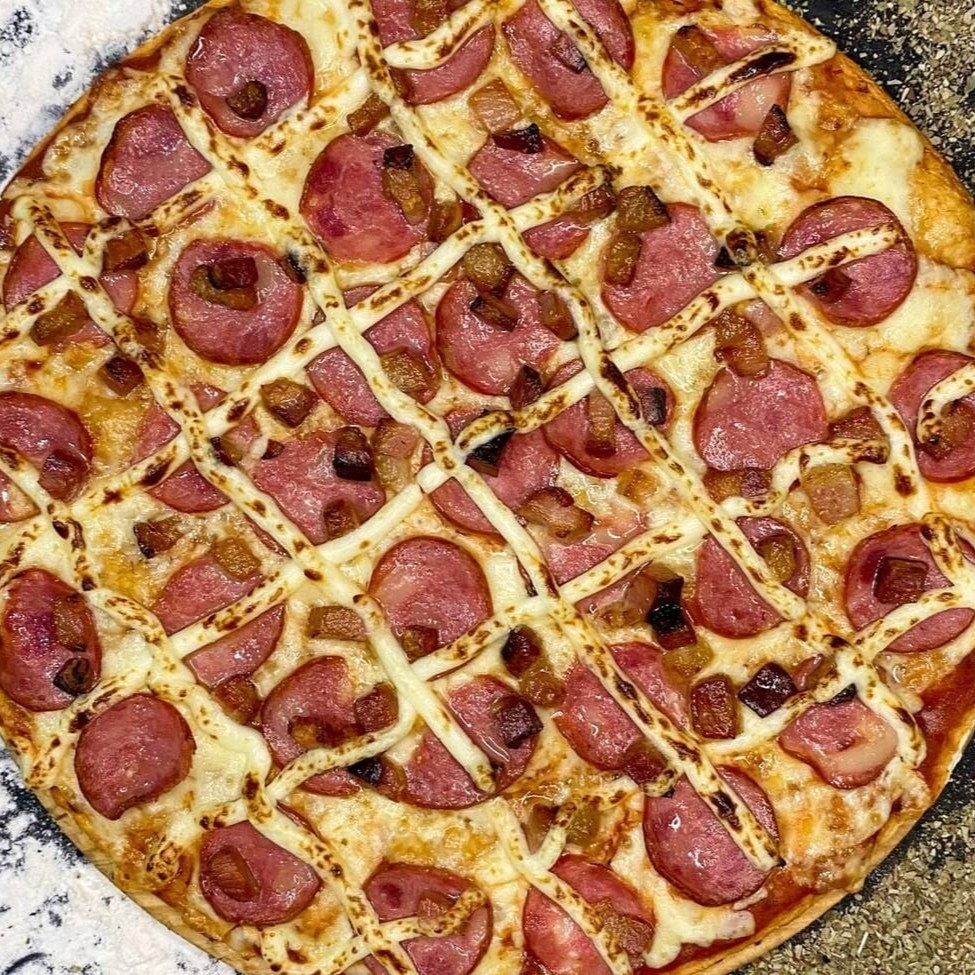 Molho de tomate especial, queijo mussarela, calabresa, bacon, requeijão e orégano