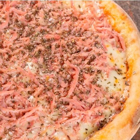 Molho de tomate próprio, mussarela importada, Presunto Ralado e orégano. A tradicional!