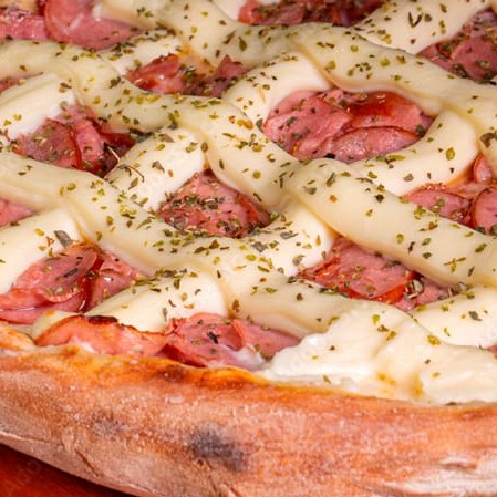 Molho de tomate próprio, mussarela importada, calabresa fatiada e orégano. A tradicional!