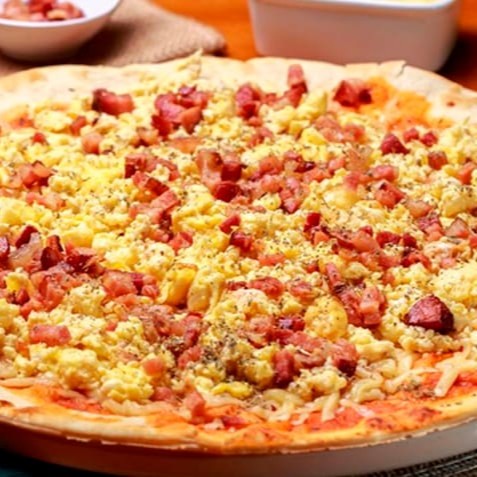 Molho de tomate especial, queijo mussarela, bacon, ovos e orégano