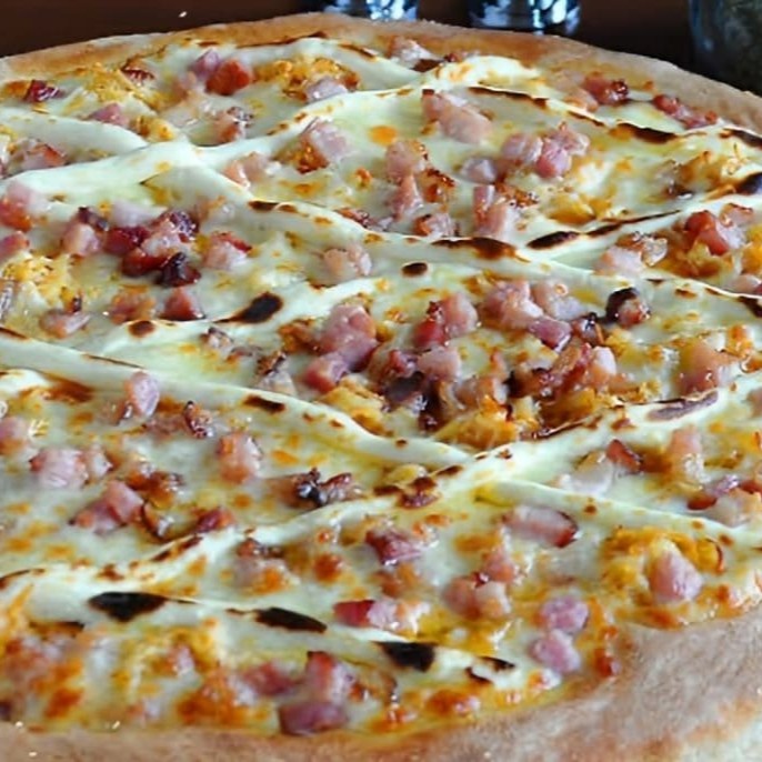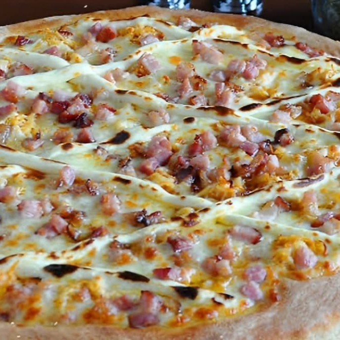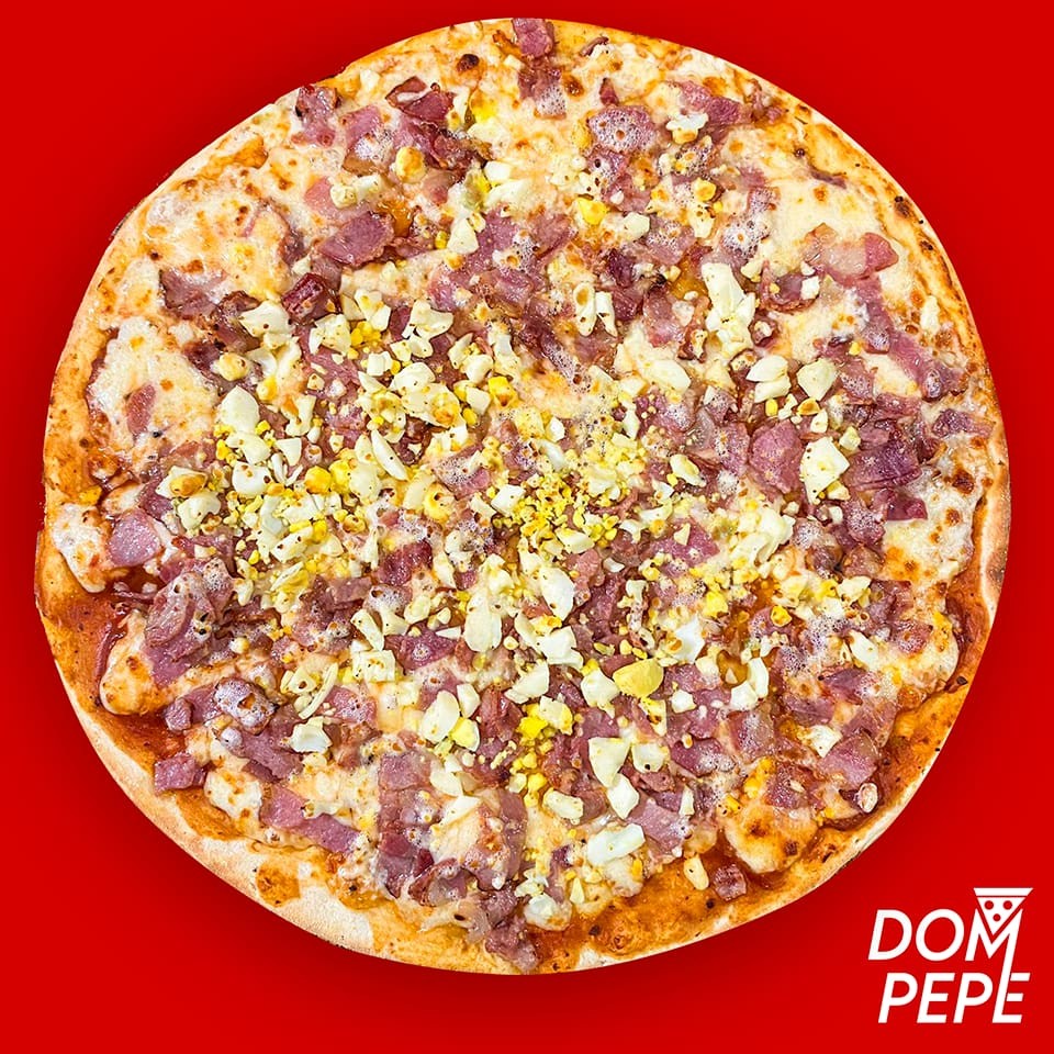 Molho de tomate próprio, mussarela importada, bacon em cubos, ovos e orégano.