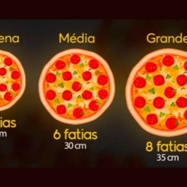Pizzas Grandes: 35 Centímetros (8 fatias) Pizzas Médias: 30 Centímetros (6 fatias) Pizzas Pequenas: 25 Centímetros (4 fatias)
